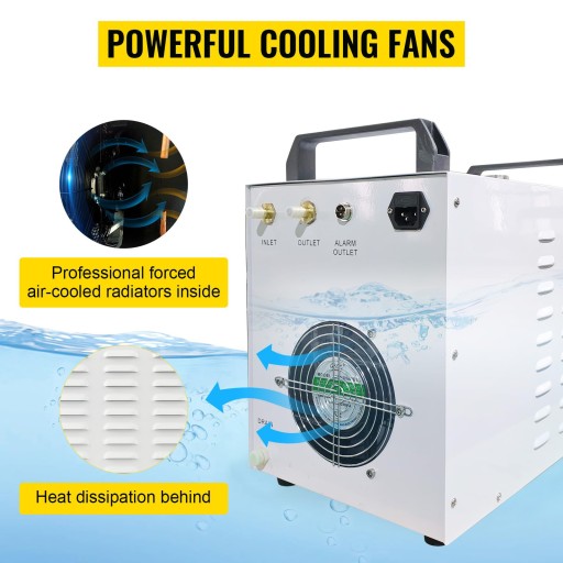 Wydajny wentylator chłodzący: Chłodziarka chłodnicy wody ma profesjonalną wymuszoną chłodnicę chłodzoną powietrzem, dużą zdolność rozpraszania ciepła i niełatwo ją zablokować. Szybkie wentylatory wewnątrz szybko odbierają ciepło.