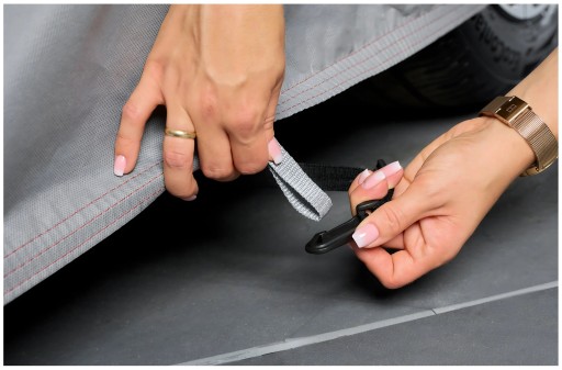 Pokrowiec wyposażony jest w wytrzymałą gumę ściągającą, która znajduje się w dolnej części, zapewniając stabilne i pewne mocowanie po obwodzie pokrowca. Dodatkowo, pokrowiec posiada oczka rozmieszczone w strategicznych miejscach obok kół auta, co umożliwia łatwe przypięcie plandeki za pomocą pasów stabilizujących. To rozwiązanie zapewnia jeszcze lepszą ochronę i pewność, że pokrowiec pozostanie na swoim miejscu, nawet w trudniejszych warunkach pogodowych.