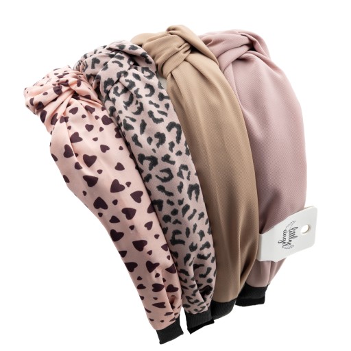 Stylowy komplet 4 miękkich opasek na włosy z efektownym węzłem na górze. W zestawie znajdują się dwa modele jednokolorowe (beż i pudrowy róż) oraz dwa wzorzyste – w serduszka i panterkę. Idealne do codziennych stylizacji, na co dzień, do pracy lub na prezent.