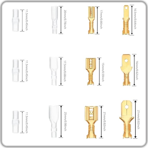 ⭐ Typ 2,8 mm: Grubość:0,25 mm (kobieta) 0,5 mm (mężczyzna) Kompatybilny przewód: 0,5-1,5 mm2 (AWG22-16)