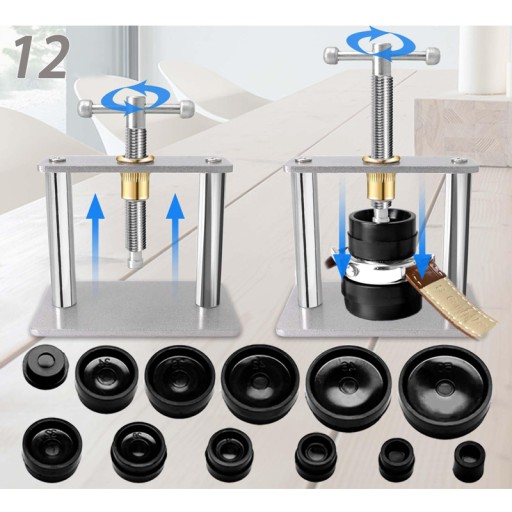 ⌚-Wyposażony w 12 kształtów tarcz dociskowych, odpowiednich do okrągłych tarcz o średnicy od 18 mm do 50 mm. Narzędzie dociskowe wykorzystuje pionowy nacisk w dół, dzięki czemu ramię napędowe i dźwignia znajdują się w linii prostej, aby zmaksymalizować nacisk w dół.