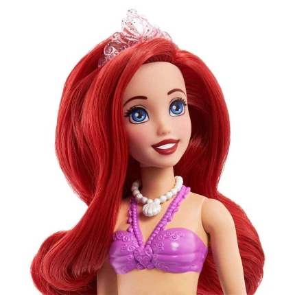 Urocza lalka Arielka ma przepiękne, długie włosy, charakterystyczny zielony ogon, który zgina się w połowie talii oraz fioletowy top z muszelek. Całość uzupełnia różowa tiara oraz naszyjnik z pereł. Dodatkowo w zestawie znajduje się uroczy przyjaciel Arielki - Krab Sebastian oraz 4 akcesoria.