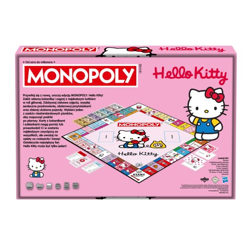 Zanurz się w urokliwym świecie Hello Kitty dzięki wyjątkowej edycji Monopoly Hello Kitty! W tej uroczej wersji klasycznej gry, każdy gracz wyrusza na słodką przygodę przez kolorowe i pełne życia ulice Sanrio Town. Przemierzaj uroczymi pionkami plansze, gromadź pieniądze i wymieniaj je na cenne pola. Strategia spotyka się z urokiem, gdy gracze rywalizują o najlepsze lokalizacje i budują swoje własne, cukierkowe imperia. Czy uda Ci się zgromadzić najwięcej słodyczy i zostać mistrzem Sanrio Town? Przygotuj się na pełną uśmiechu i radości rozgrywkę - każdy ruch niesie ze sobą odrobinę magii Hello Kitty!