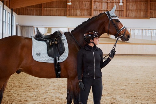 Wierzch wykonany z eleganckiego, satynowego materiału zachwyca subtelnym połyskiem, a spód typu cool-dry skutecznie odprowadza wilgoć, zapewniając suchość i komfort grzbietu konia podczas pracy. Średnio grube pikowanie w kształcie chmurek "Cloud" nadaje czaprakowi wyjątkowy charakter i równomiernie rozkłada nacisk siodła.