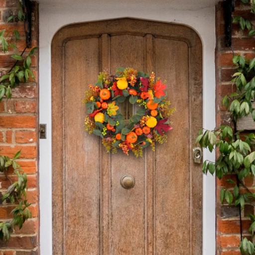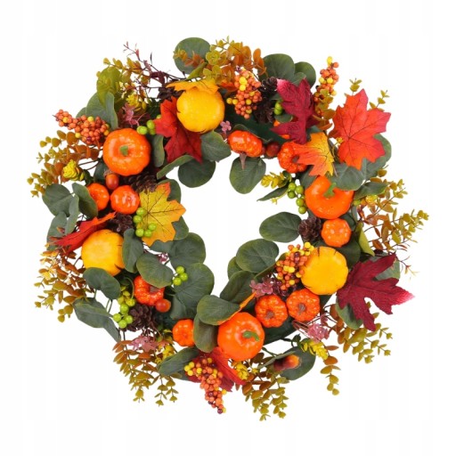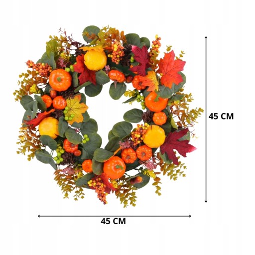 ✔️ Jesienny wianek dekoracyjny to wyjątkowa ozdoba, która odmieni każde wnętrze i doda uroku drzwiom wejściowym. Sztuczne dynie, kolorowe liście, zielone gałązki, jagody i szyszki tworzą niezwykle realistyczną kompozycję. Wianek wykonany jest z trwałych materiałów, dzięki czemu będzie cieszył oko przez wiele sezonów.