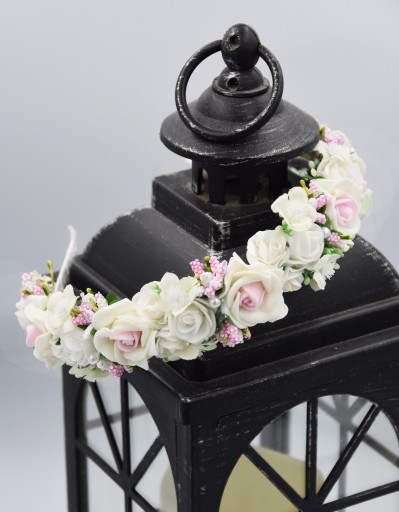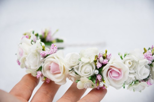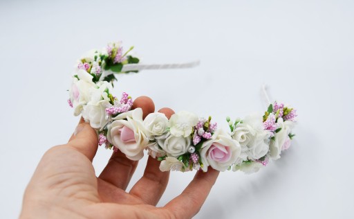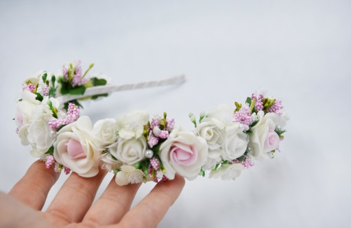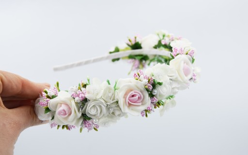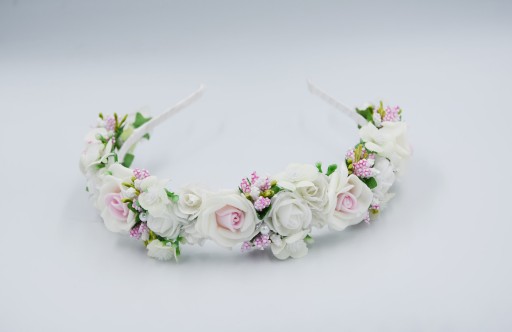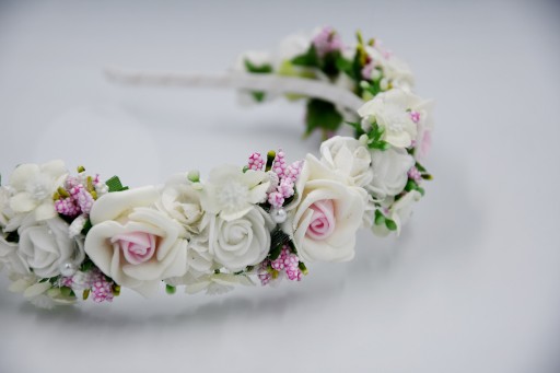 - Kolor : opaska - bała, różowe i białe kwiaty, oraz białe z zielonym dodatki, perełki
