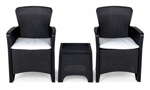 - Skład zestawu: Stolik, dwa fotele, komplet poduszek