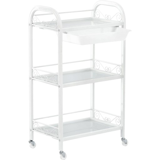 Jest ergonomiczny, pozwala na zaoszczędzenie czasu i miejsca w salonie. Dodatkowo, zamontowane kółka, na pewno przyczynią się do poprawy komfortu pracy.