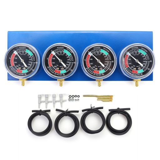- Każda jednostka zawiera precyzyjne wskaźniki zamontowane na solidnej metalowej podstawie do użytku na blacie, gwintowane mosiężne przedłużki gaźnika (65 mm i 180 mm), złącza i wąż próżniowy.