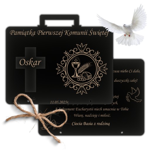 Elegancka i nietuzinkowa kartka w kształcie walizki, zaprojektowana jako wyjątkowa Pamiątka Pierwszej Komunii Świętej. Idealna do wręczenia z życzeniami, prezentem pieniężnym lub symbolicznym drobiazgiem.
