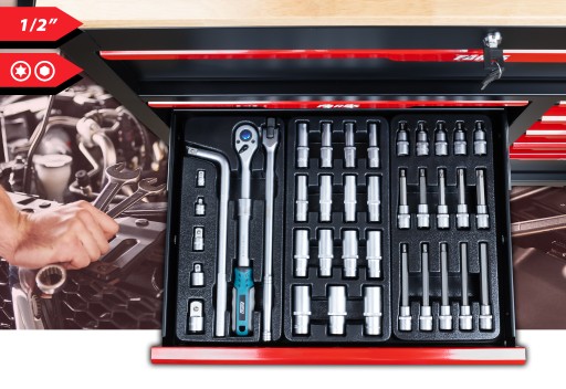 2. zestaw 3 wkładek:. (grzechotka teleskopowa, pokrętło, pokrętło uchylne, redukcje, nasadki długie na 1/2", torxy i imbusy na 1/2 w obsadzie)