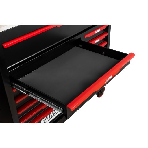 - Antypoślizgowa mata o grubości 2,5 mm na dnie szuflad – zapobiega przesuwaniu się narzędzi, chroniąc je przed uszkodzeniem.