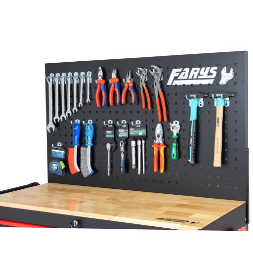 Solidny, profesjonalny stół warsztatowy FR4038 to idealne rozwiązanie do garażu, warsztatu lub zakładu produkcyjnego. Zapewnia maksymalną organizację i łatwy dostęp do narzędzi, a jednocześnie wyróżnia się trwałością i mobilnością. Ten solidny wózek wyposażony jest w drewniany blat nad którym zamontowana jest perforowana ścianka z 20 haczykami i ergonomiczny uchwyt, który można zamontować po obu stronach, co zapewnia maksymalną wygodę użytkowania.