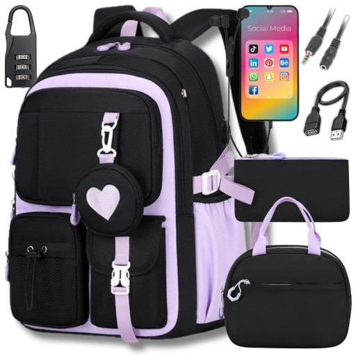 - Do plecak dołączony jest kabel USB, kabel do słuchawek Jack, kłódka na szyfr, breloczek saszetka, piórnik, torebka/śniadaniówka