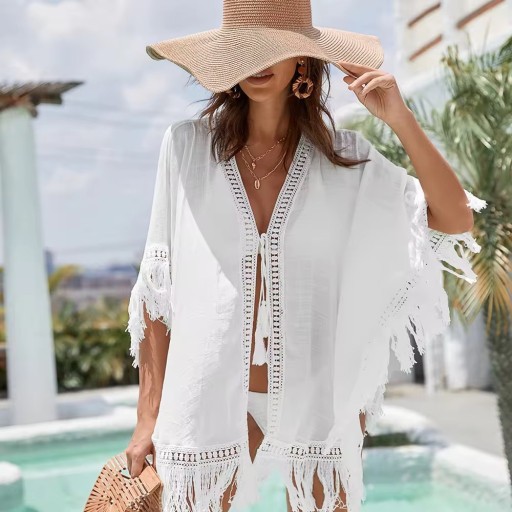 Stylowa i lekka narzutka plażowa w stylu boho to idealny wybór na lato! Wykonana z przewiewnej, przyjemnej w dotyku tkaniny, ozdobiona delikatną koronką wzdłuż dekoltu i rękawów. Frędzle na dole i przy mankietach dodają jej swobodnego, wakacyjnego charakteru.