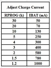 Prąd ładowania można zmodyfikować poprzez zmianę rezystora R_PROG zgodnie z dokumentacją układu TP4056.