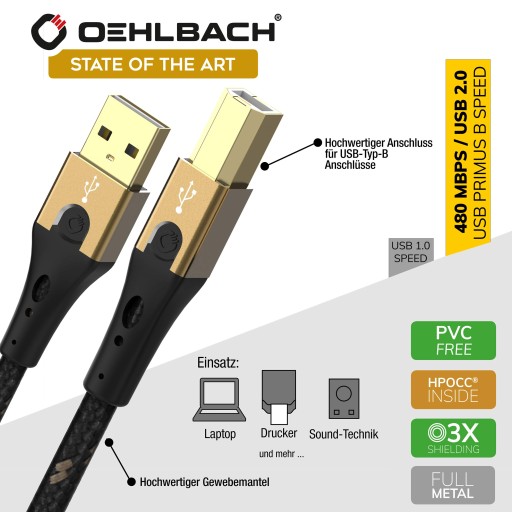 Oehlbach Primus kabel USB typu B 2.0 - State of The Art - High Speed 480 Mb/s bardzo elastyczna metalowa wtyczka HPOCC 3-krotne ekranowanie - drukarka, skaner, wzmacniacz audio - czarny/złoty - 2 m