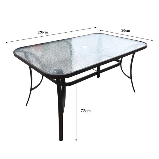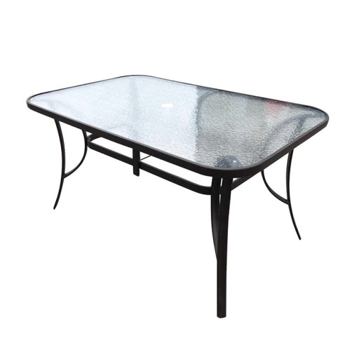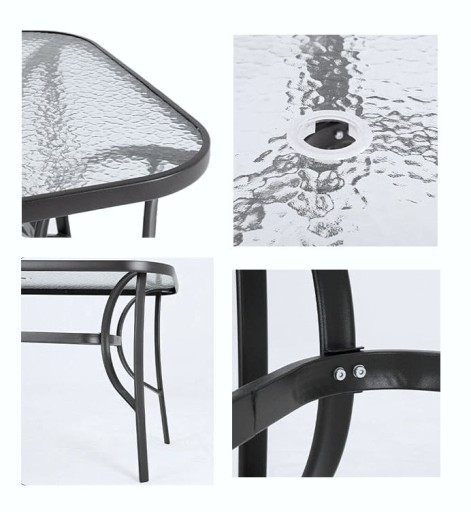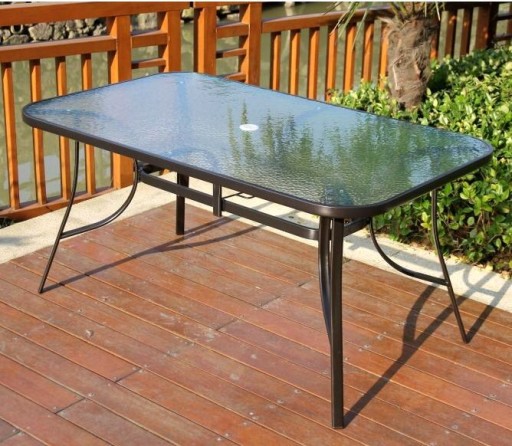 - Hartowany blat szklany – przezroczyste szkło o dekoracyjnym wzorze fali jest nie tylko eleganckie, ale także odporne na uderzenia, wysoką temperaturę i warunki atmosferyczne.