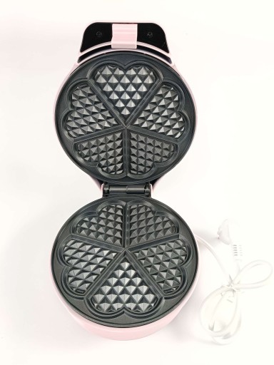 Dekoracyjny gofrownica do delektowania się 5 świeżo przygotowanymi goframi w kształcie serca – idealne do wspólnego pieczenia na stole – Zalety powłoki nieprzywierającej: pieczenie bez przypalania i przyklejania, łatwe wyjmowanie ciasta, łatwiejsze płukanie – bezpieczna obsługa: izolowana termicznie obudowa z klipsem na pokrywie, stabilna podstawa dzięki antypoślizgowym nóżkom, automatyczna regulacja temperatury – konstrukcja oszczędzająca miejsce i praktyczny zwijacz kabla (długość kabla: 73 cm), nadmiar. Widoczność dzięki konstelacji pracy. Lampka kontrolna i wskaźnik gotowości.