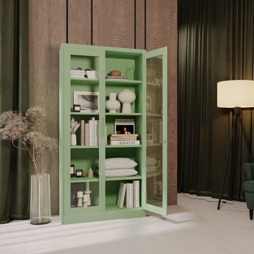 Szklana witryna AMELIA jest wykonana z solidnych stalowych elementów o grubości 0,6 mm, pokrytych farbą proszkową w odcieniu pastelowej zieleni.