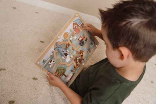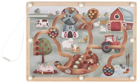 Magnetyczny labirynt Little Farm FSC od Little Dutch. Ta wspaniała gra zręcznościowa, która została zaprojektowana do rozwijania umiejętności motorycznych dziecka w trakcie zabawy. Dzieci są zachęcane do przejścia całego labiryntu kuleczkami za pomocą dołączonego do zestawu rysika. Chwyć jedną lub więcej kulek za pomocą odpowiedniego rysika i przenieś je w wybrane miejsce. Możesz na przykład przenieść wszystkie niebieskie kulki do stawu, a czerwone do jabłoni. Po drodze możesz napotkać przeszkody, takie jak obracające się koło traktora i żagle wiatraka. Ta zabawka stymuluje koordynację ręka-oko i doskonale rozwija umiejętności motoryki małej. Będzie stanowić również piękny element wyposażenia pokoju dziecięcego. Zabawka wykonana jest z drewna z certyfikatem FSC i pokryta farbami na bazie wody. Stanowi świetny pomysł na prezent i doskonałe uzupełnienie dla pozostałych zabawek z kolekcji Little Farm od Little Dutch.