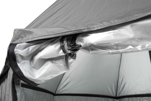 Parasol po rozłożeniu oferuje wystarczająco dużo przestrzeni, by pomieścić dwóch wędkarzy oraz cały niezbędny sprzęt.