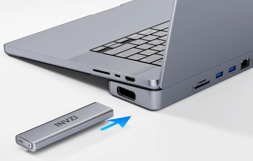 Jednym z wyróżniających się elementów Huba INVZI jest wysuwana obudowa na dysk SSD. Obsługuje ona dyski M.2 SATA oraz NVME SSD, co pozwala na łatwe rozbudowanie przestrzeni dyskowej laptopa. Co więcej, umożliwia dodanie dodatkowej pamięci do McBooka do 4 TB, dzięki czemu możesz bez problemu zwiększyć pojemność swojego komputera. To idealne rozwiązanie dla osób, które potrzebują dużo miejsca na swoje pliki i dokumenty, a jednocześnie cenią sobie wygodę i łatwość podłączenia urządzeń.