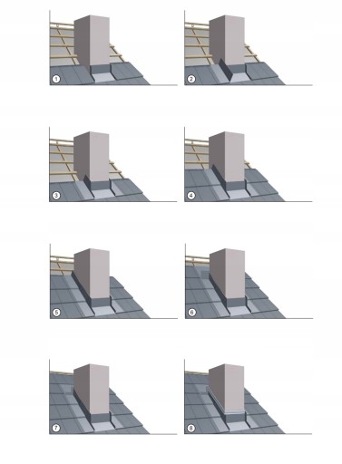 - Wyprofilować elementy boczne, piersiowe i tylne. Taśmę należy przykleić tylko do dachówki, nie wolno jej mocować do komina.