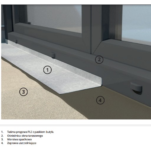 Taśma progowa z wtopionym paskiem butylu służy do uszczelnienia tarasu lub balkonu w miejscu osadzenia drzwi.