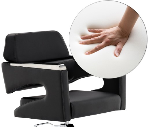Fotel charakteryzuje się eleganckim i ergonomicznym designem, który pozwala na wygodną pracę fryzjera oraz relaks klientów.