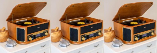 Możesz także odtwarzać dowolne źródło muzyki za pośrednictwem wejścia AUX i wyjść RCA za pomocą kabla audio. Dodatkowo gramofon posiada radio DAB+, odtwarzacz CD i magnetofon kasetowy.