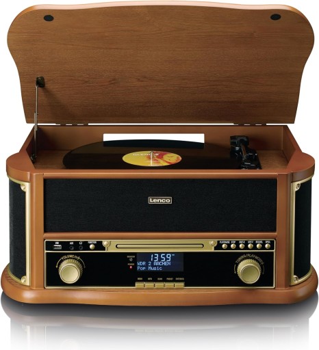 Lenco TCD-2571 to klasyczny system muzyczny vintage, obsługujący wiele formatów, w tym gramofon, radio DAB+, odtwarzacz CD/MP3, Bluetooth, USB i kasetę.