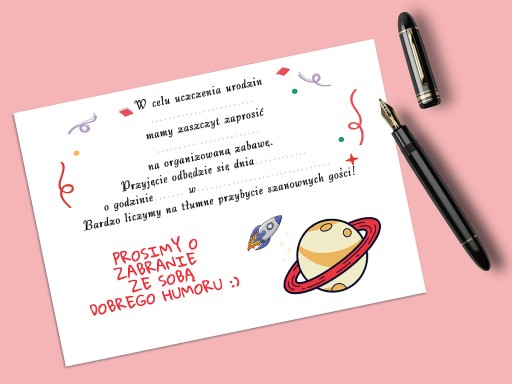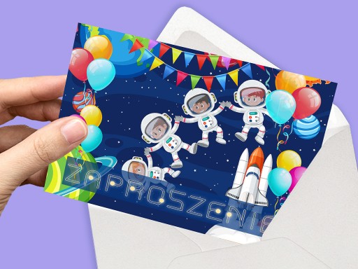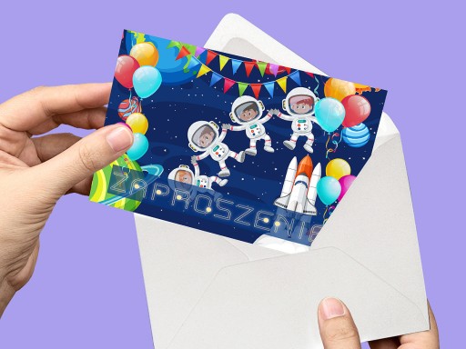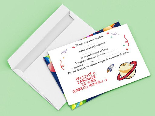 ZAPROSZENIE NA URODZINY KOSMOS RAKIETA PLANETY KOSMONAUCI + KOPERTA