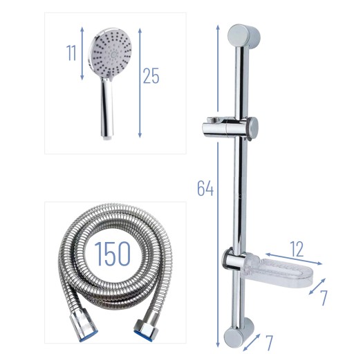 - Chromowany drążek prysznicowy z regulowanym uchwytem na słuchawkę – umożliwia łatwe dopasowanie wysokości do użytkownika.