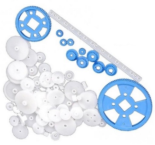 Uniwersalny pakiet kół zębatych oraz zębatek i innych elementów. Jest to podręczny zestaw dla każdego który z pasją buduje urządzenia mechaniczne z przekładaniami i napędem.