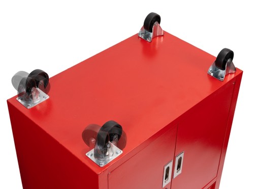 Wyposażenie wózka w duże kółka oraz ergonomiczny uchwyt pozwala na jego łatwe przemieszczanie. Dwa niezależne zamki w szufladzie i szafce zapewniają bezpieczne przechowywanie narzędzi