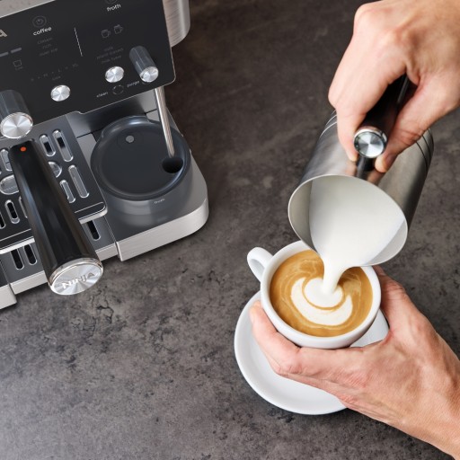 Stalowy dzbanek z wyjmowaną trzepaczką sprawia, że zarówno mleko krowie, jak i napoje roślinne zamienią się w aksamitną piankę – a czyszczenie ogranicza się do jednego kliknięcia trybu Auto-Clean.