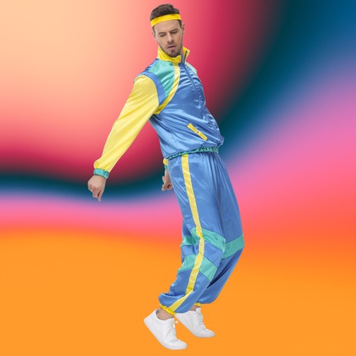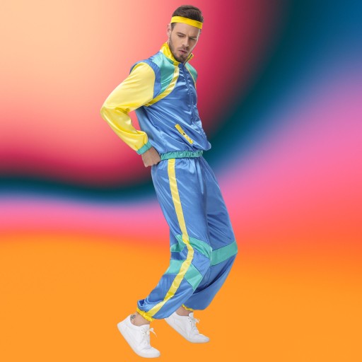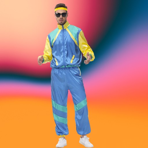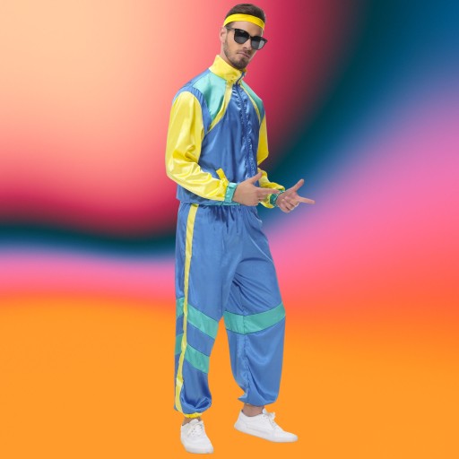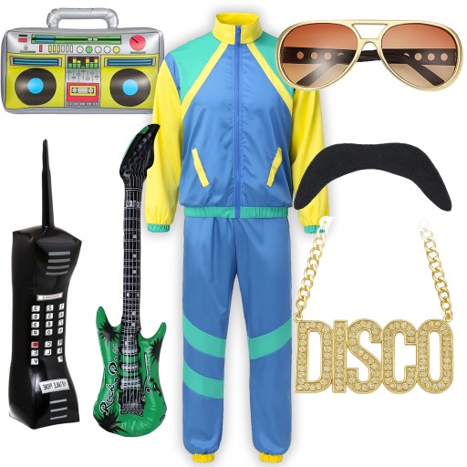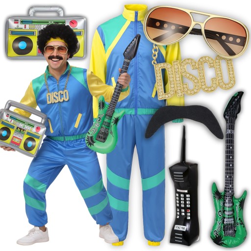 ⭐ W zestawie znajdziesz bluzę ortalionową zapinaną na zamek błyskawiczny, długie, ściągane spodnie dresowe na gumce oraz opaskę na głowę, dmuchany boombox, komórkę, gitarę, okulary, wąsy oraz łańcuch,