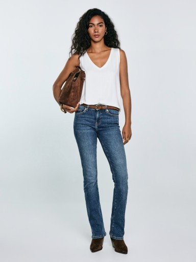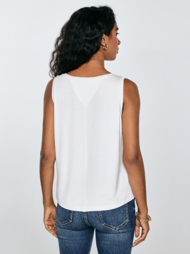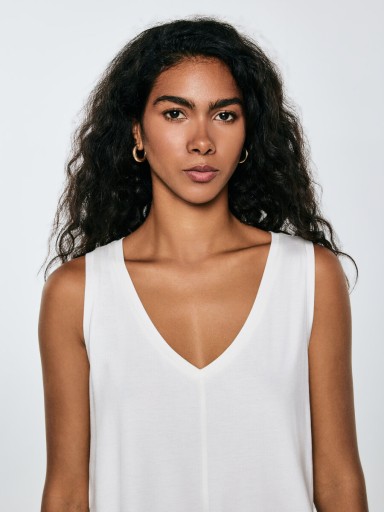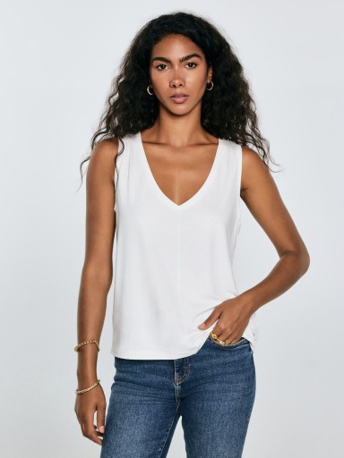 Lekka i kobieca koszulka w klasycznym białym kolorze, wykonana z przyjemnej, delikatnej dzianiny. Dekolt w serek subtelnie podkreśla szyję i ramiona, a dekoracyjne przeszycie na środku nadaje całości elegancki akcent. Dół koszulki zdobi skórzana naszywka z logo marki - stylowy detal, który dodaje charakteru. Idealna baza do wielu letnich stylizacji - sprawdzi się zarówno na co dzień, jak i w bardziej casualowych zestawach.