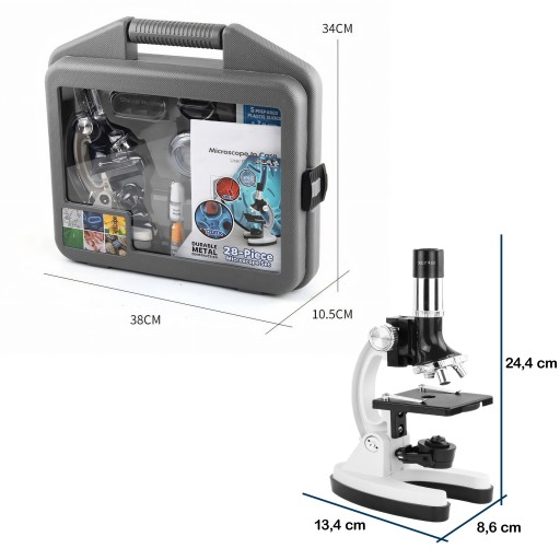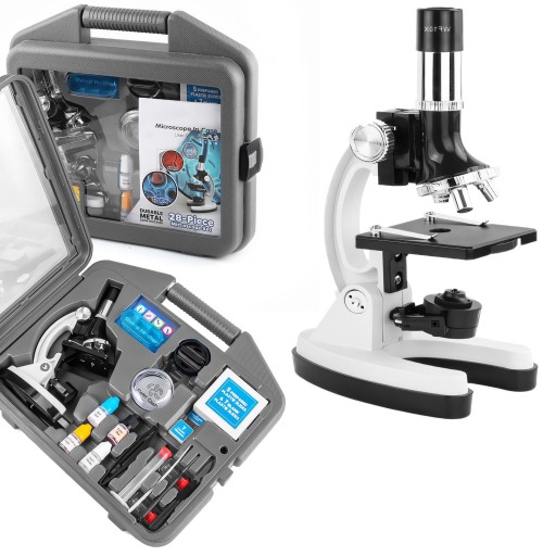 ❗ W zestawie znajdują się Mikroskop + Zestaw akcesoriów (Skalpel, Igła, Mieszadło, Cylinder pomiarowy, Fiolki, Pęseta, Etykiety, Zapasowa żarówka, Szkiełka, Puste Preparaty, Mikro-krajarka,Naczynie Petriego, Środki gumowe, Eosin, Sól morska, Szkiełkanakrywkowe) ❗