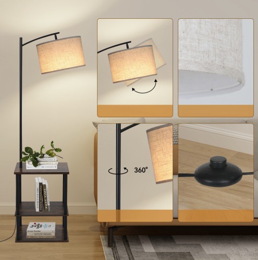 - Nowoczesny Wygląd: Połączenie metalowej konstrukcji, półek w kolorze drewna i lnianego abażura sprawia, że lampa doskonale pasuje do wnętrz klasycznych i nowoczesnych. "Prezentuje się bardzo dobrze" i jest "elegancka".