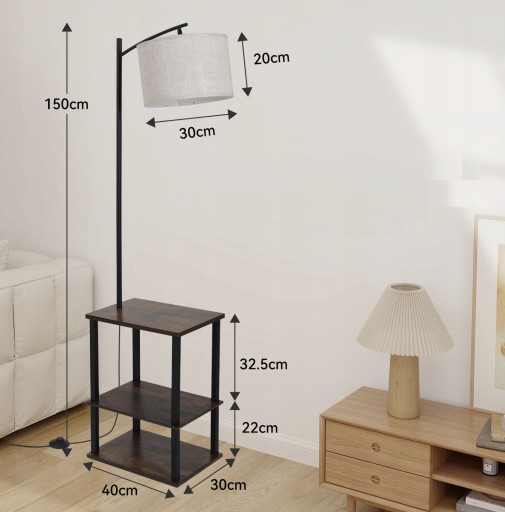 - Kolor: Czarny stelaż, brązowe półki, beżowy abażur