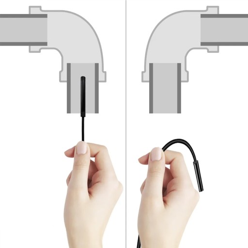 Wysokiej jakości, giętki przewód o długości 3,5 metra zapewnia łatwe manewrowanie w wąskich, trudno dostępnych przestrzeniach. Wodoodporna końcówka (IP67) pozwala na bezpieczną pracę w wilgotnym środowisku – np. w rurach, odpływach czy silnikach.
