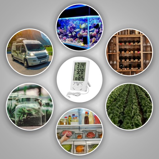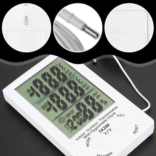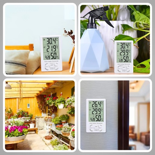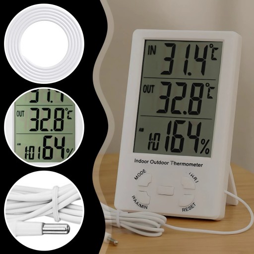 Termometr wskazuje temperaturę zarówno wewnętrzną, jak i zewnętrzną (dzięki sondzie), co pozwala na kompleksowy monitoring warunków atmosferycznych. To praktyczne rozwiązanie dla każdego domu, balkonu czy szklarni.