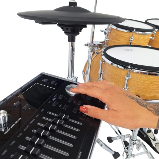 Co więcej, wygląd zestawu GRV do złudzenia przypomina tradycyjną perkusję akustyczną. Korpusy bębnów wykonane są z wysokiej jakości drewna, posiadają obręcz 1,6mm, solidne gniazda oraz lugi tubowe, co sprawia że bębny prezentują się wyjątkowo. Duże talerze, takie jak 15-calowe crashe oraz 18-calowy ride oferują dynamiczne i naturalne odczucia podczas gry. 13-calowy hi-hat na statywie zapewnia precyzyjną kontrolę nad dźwiękiem, a wszystkie te elementy zamontowane są na solidnych statywach, które gwarantują stabilność nawet podczas intensywnej gry.