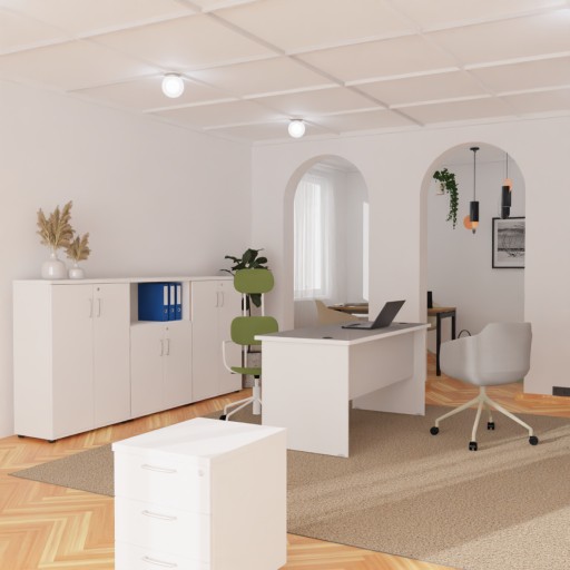 Dzięki ponadczasowemu wzornictwu, możliwość konfiguracji oraz dużej powierzchni pracy, biurko doskonale sprawdzi się zarówno w małych, jak i dużych biurach. Kontener sprawi, że rzeczy najpotrzebniejsze masz zawsze pod ręką. Trzy regały to dodatkowe miejsce idealne dla segregatorów.