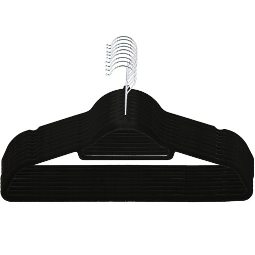 Opływowy kształt wieszaka sprawia, że ubrania stabilnie trzymają się jego powierzchni. Dodatkowym atutem produktu jest wykończenie welurowe i specjalne wcięcia po bokach, dzięki którym bluzki, koszule, marynarki i sukienki nie zsuwają się.