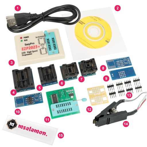 ✅ Bardzo duży zestaw, który zaprogramuje wiele różnych pamięci na 5V, 3,3V, a nawet 1,8V! Poradzi sobie również z nowymi układami przez specjalne adaptery.