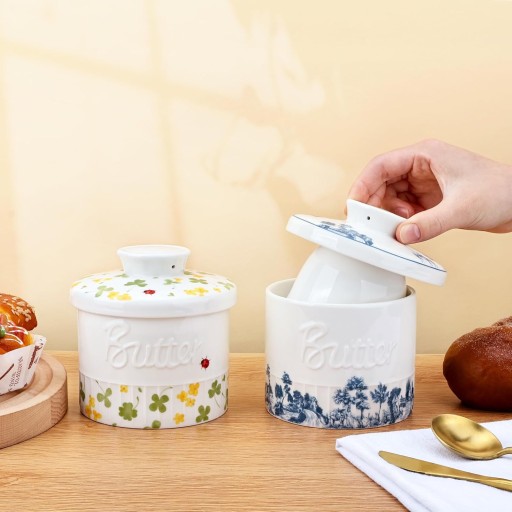 ⭐Wysokiej jakości ceramiczny pojemnik na masło: Bezołowiowa, odporna na odpryski i bardziej wytrzymała niż kamionka. Materiał naszego francuskiego porcelanowego pojemnika na masło z pokrywką blokuje nieprzyjemne zapachy i jest odporny na wchłanianie wilgoci. Ponadto ten francuski pojemnik na masło jest bezpieczny w kuchence mikrofalowej, zmywarce i zamrażarce.