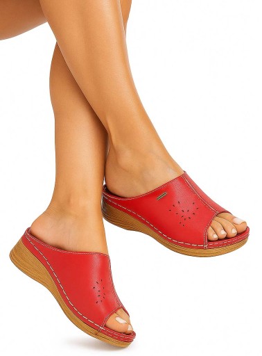 Gładkie damskie klapki w kolorze czerwonym na niskim koturnie. Idealnie sprawdzą się jako obuwie codzienne. Z łatwością dopasują się również do eleganckich stylizacji. Profilowana, skórzana wkładka zapewnia komfort użytkowania. Szyta podeszwa skutkuje dłuższą wytrzymałością obuwia.